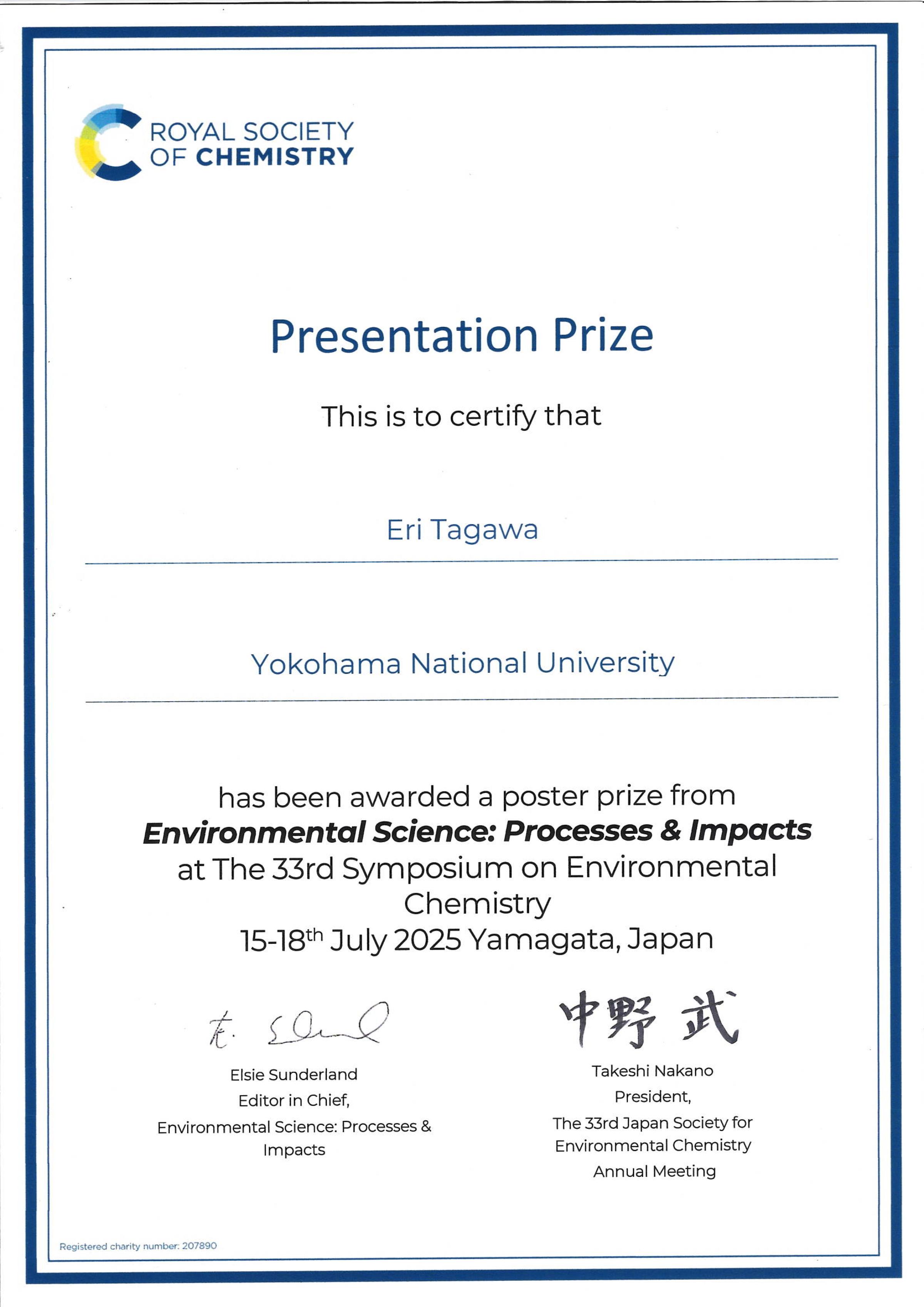2025年 7月 15日~18日、「山形テルサ」および「やまぎん県民ホール」で開催された第33回環境化学討論会/第29回日本環境毒性学会研究発表会の合同大会である「第4回環境化学物質合同大会」にて大学院環境情報学府 博士課程後期 1年の田川瑛梨さん (指導教員: 三宅祐一教授) が優秀発表賞(Royal Society of Chemistry賞)を受賞しました。