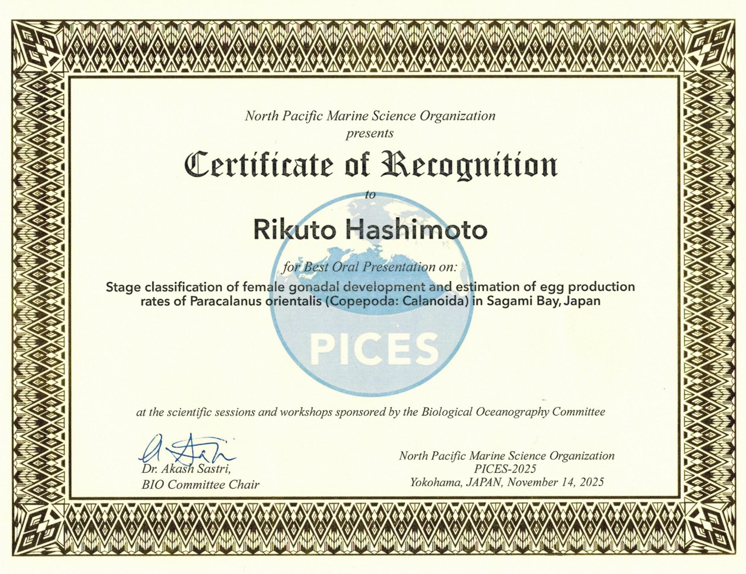 大学院環境情報学府博士前期課程2年の橋本 陸人さん(指導教員:下出 信次 教授)が、2025年11月10日(月)〜14日(金)に横浜市で開催された国際会議PICES-2025 Annual Meeting(PICES:North Pacific Marine Science Organization、北太平洋海洋科学機構)において「Beset Oral Presentation」を受賞しました。
