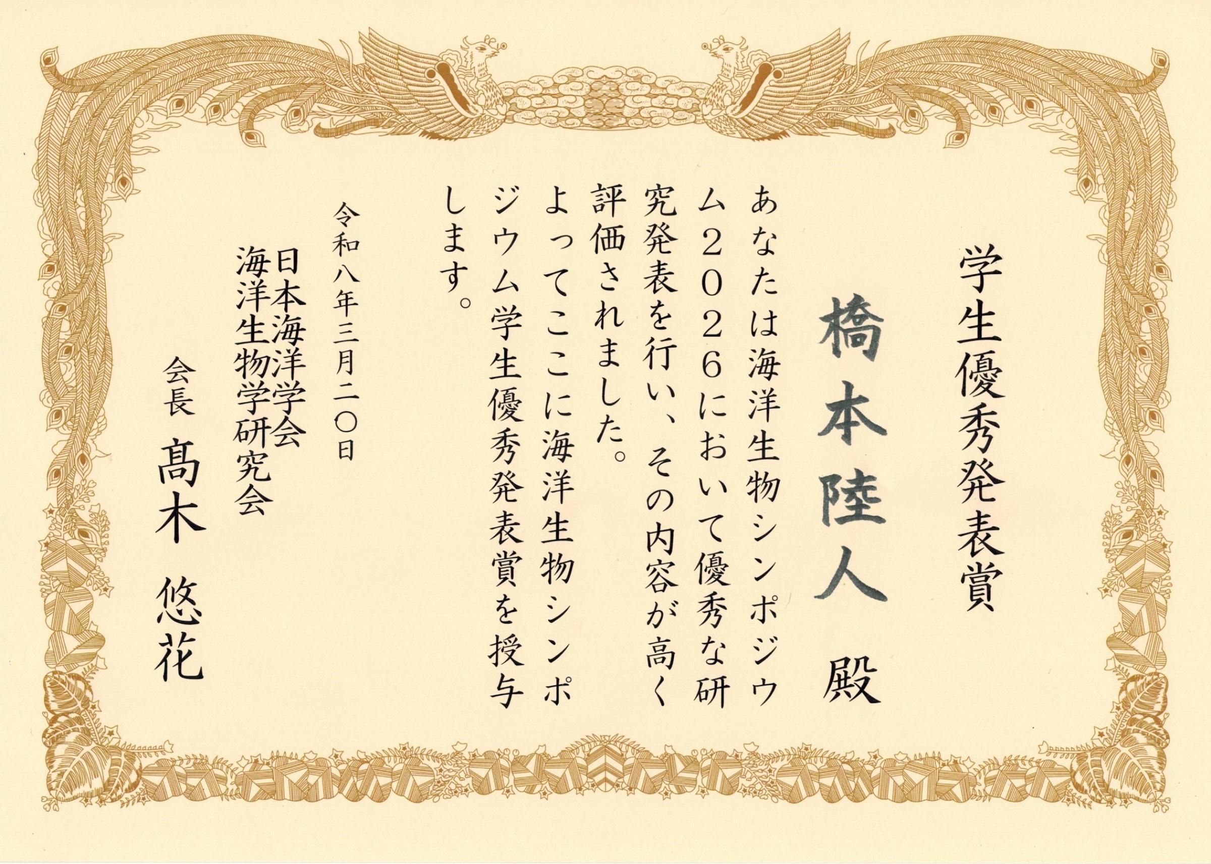 環境情報学府博士課程前期2年生の橋本 陸人さんが海洋生物シンポジウム2026」において「学生優秀発表賞」を受賞