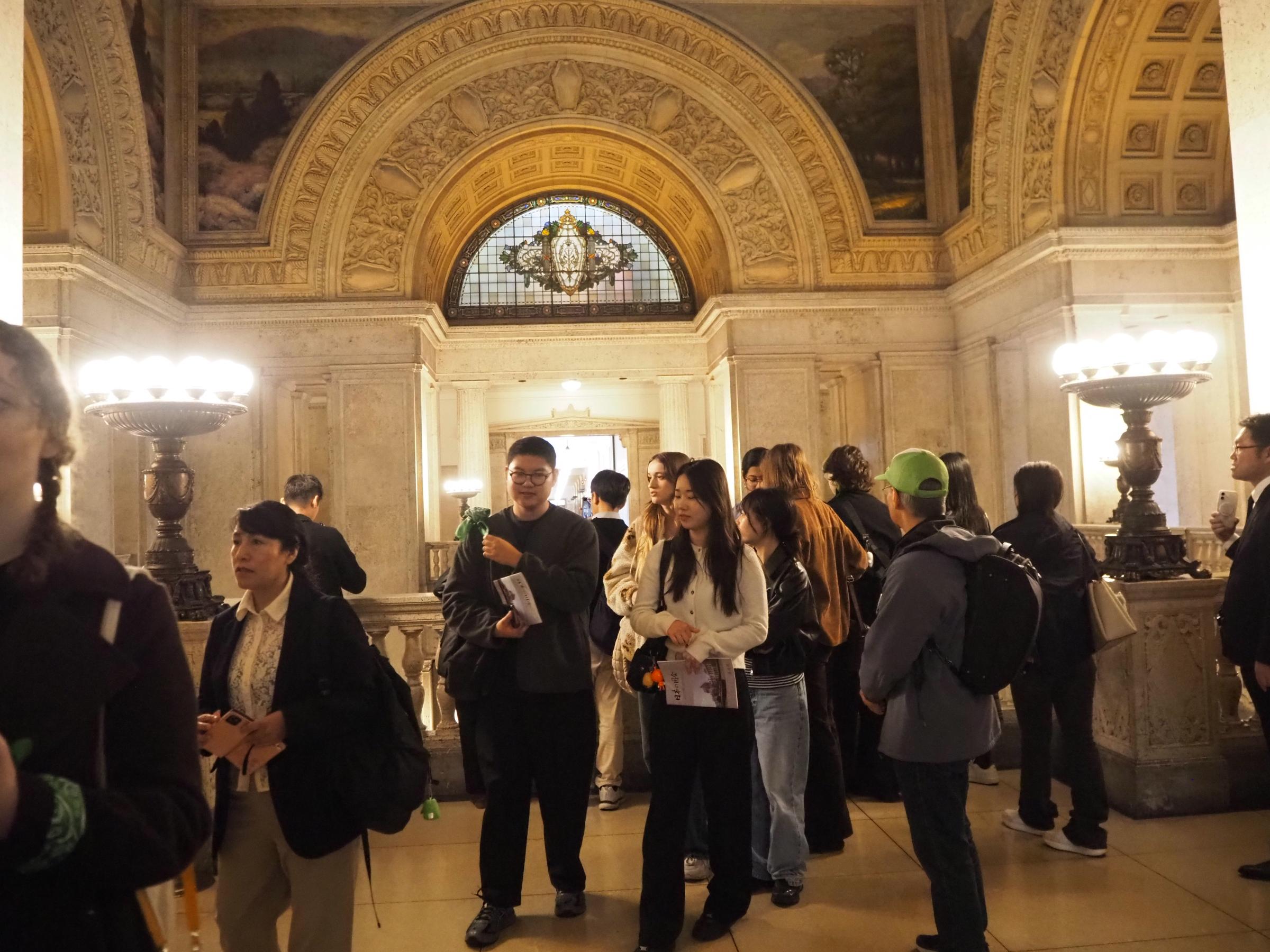Inside, the early Showa period architecture impressed everyone with its grandeur, detailed decorations, and the majestic main chamber, where students attentively observed.