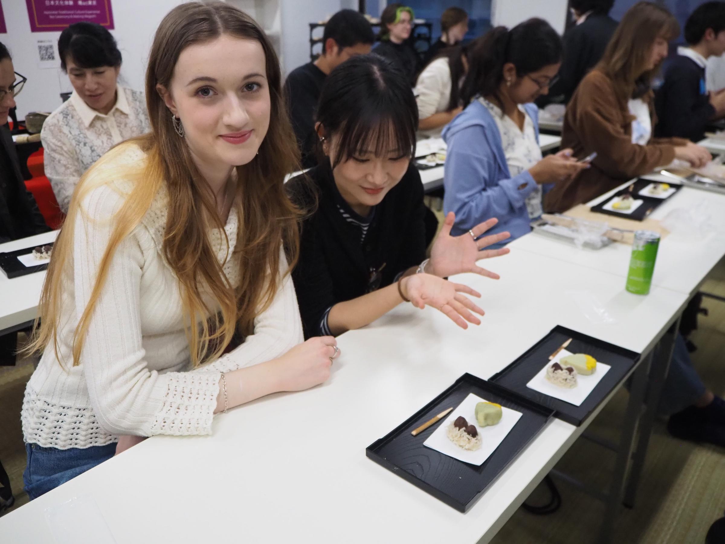 In the afternoon, students visited “AN Tokyo”, a cultural experience center, to make nerikiri wagashi (traditional sweets) and enjoy matcha tea. Using seasonal motifs such as ginkgo and chestnut, participants shaped and colored their sweets with tools used by professional artisans.