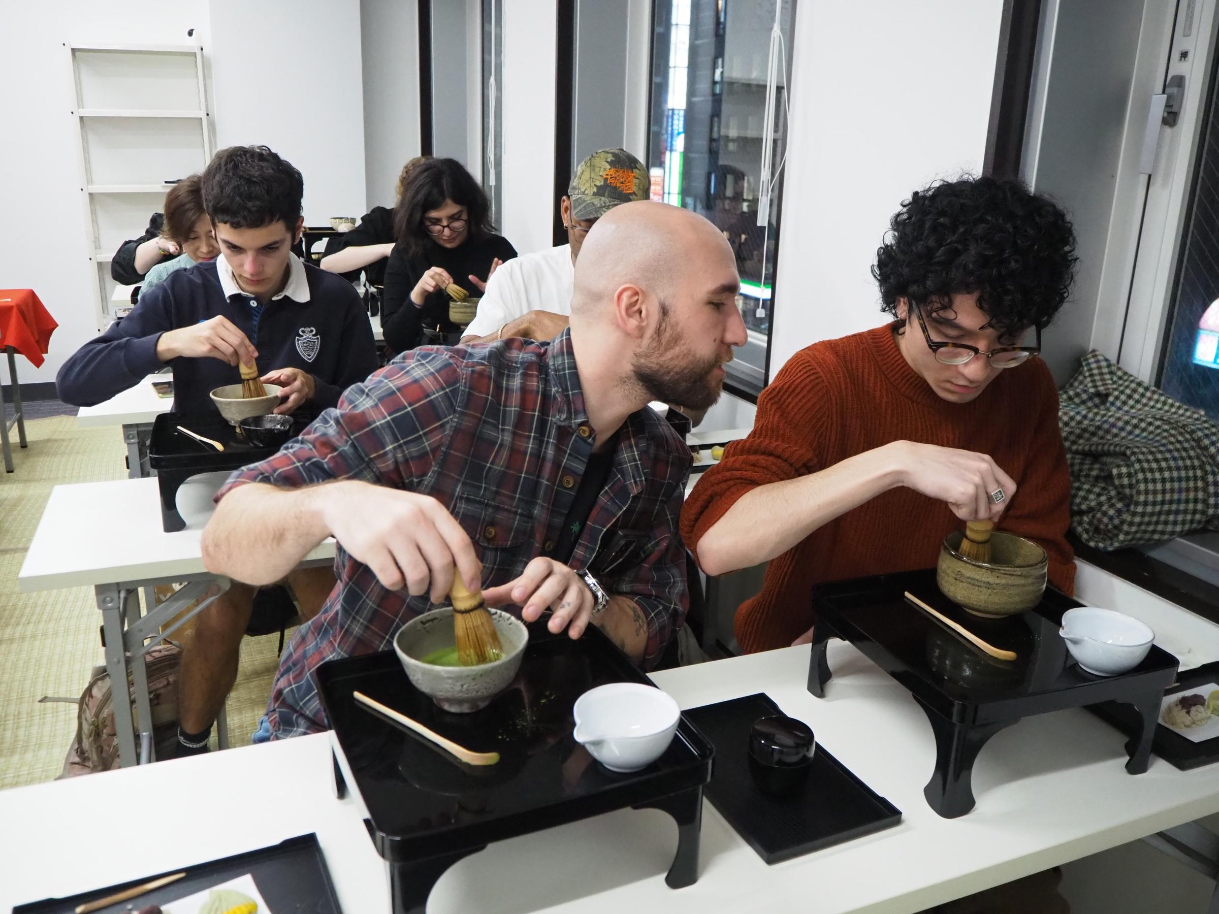 During the matcha session, students learned the differences between sencha and matcha, explored the cultivation and production process, and observed a live tea preparation demonstration. Each student then prepared matcha themselves and enjoyed it alongside the sweets they had crafted—an immersive experience of Japanese traditional culture using all five senses.