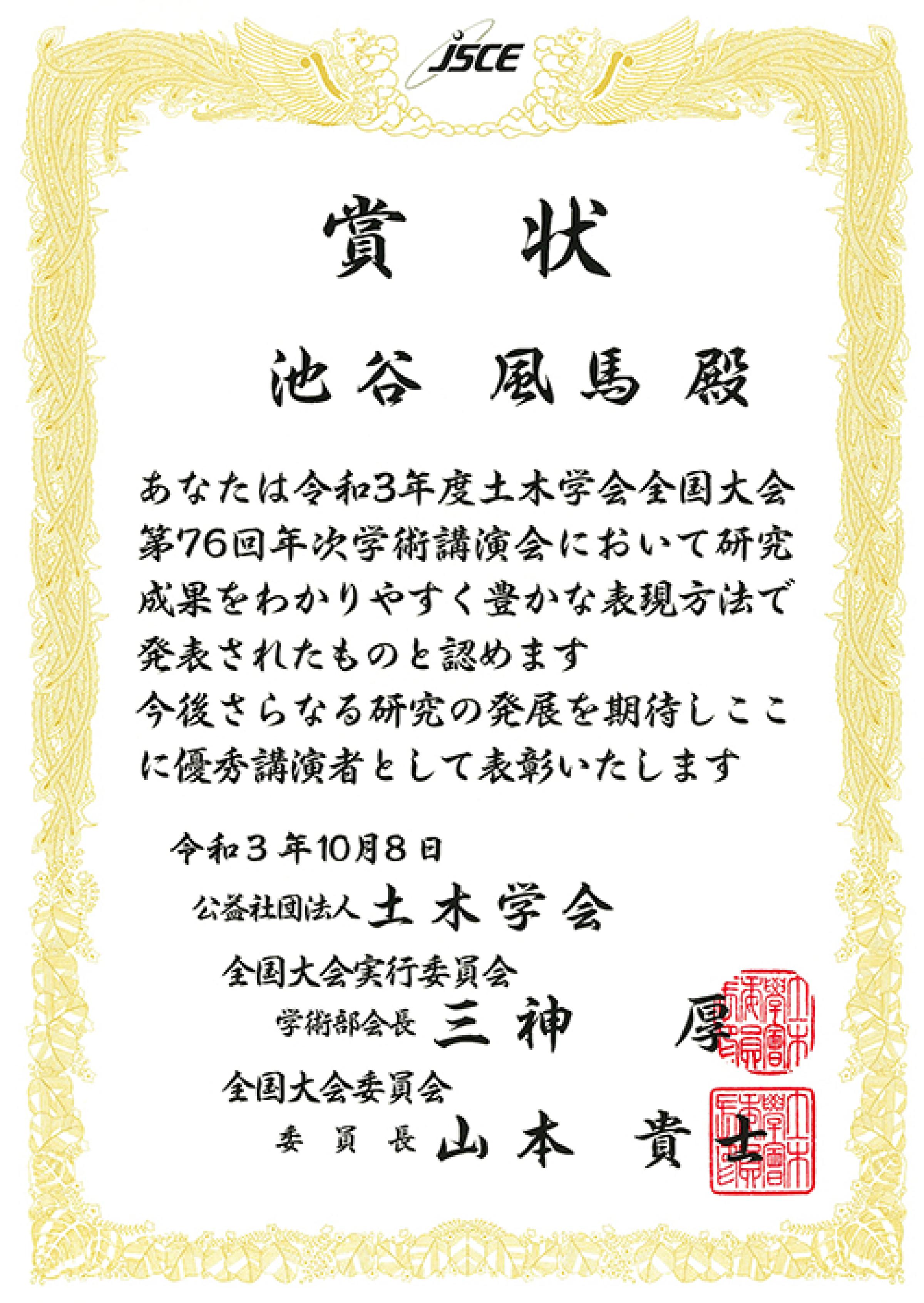 2021年 9月 6日(月)~ 10日(金)にオンラインにて開催された令和 3年度全国大会 第 76回年次学術講演会(主催 公益社団法人土木学会)にて、大学院都市イノベーション学府 博士課程後期 2年 池谷風馬さん(指導教員:田中伸治 教授)が、優秀講演者として表彰されました。