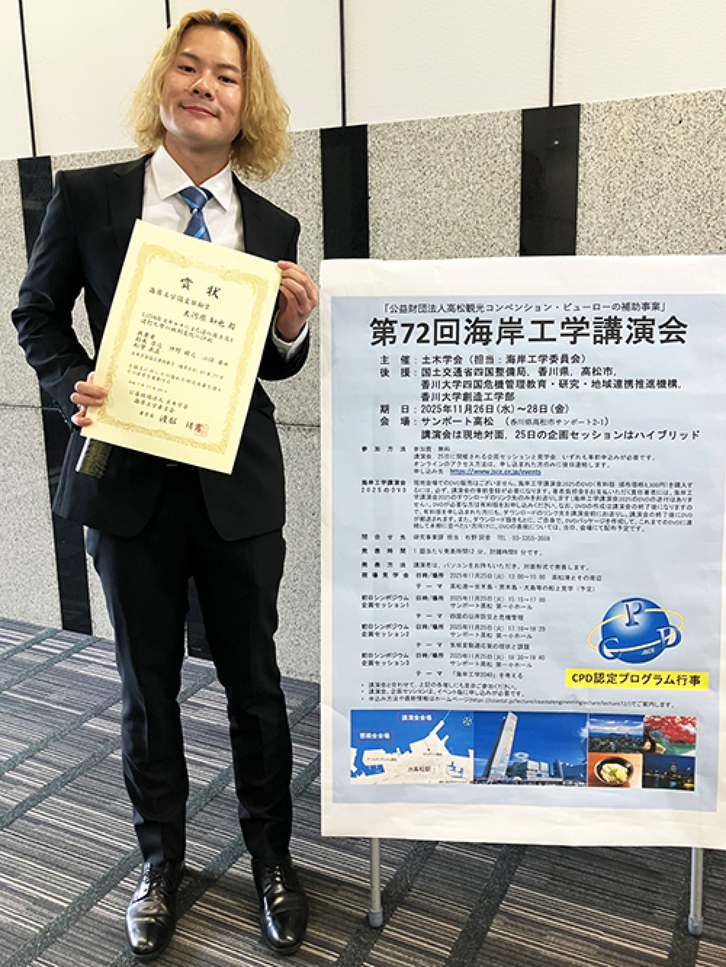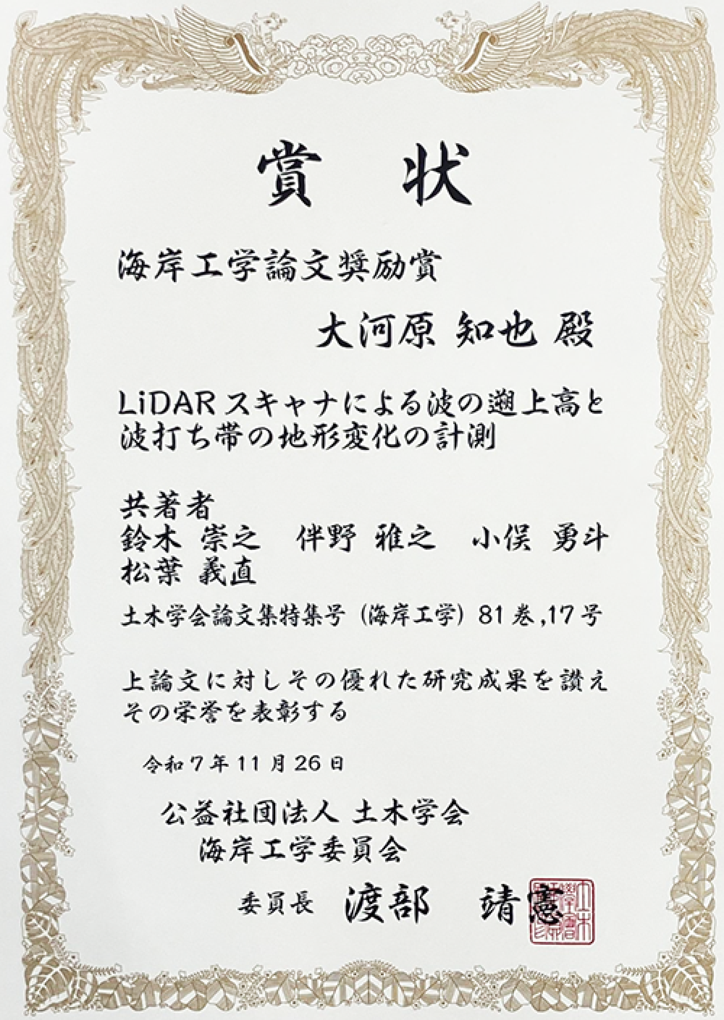都市イノベーション学府、都市地域社会専攻都市基盤系の大河原知也さん(博士課程前期 2年、指導教員:鈴木崇之 教授)が「海岸工学論文奨励賞」を受賞しました。 2025年 11月 26日にサンポート高松で行われた第 72回海岸工学講演会で賞状が授与されました。