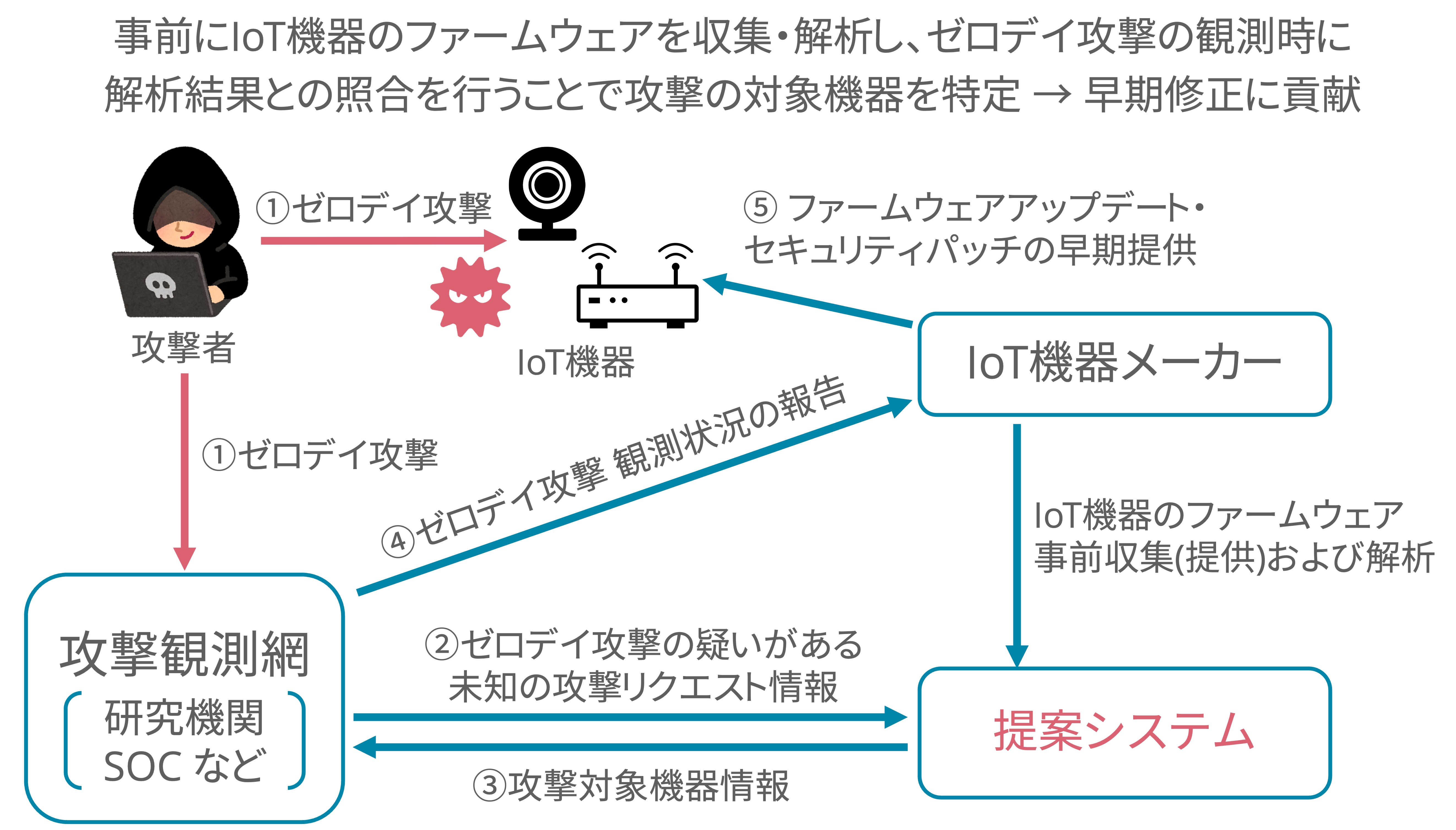 九鬼:「ゼロデイ攻撃の対象となるIoT機器を早期特定するシステムの開発」です。IoT機器に脆弱性が見つかると、通常はメーカーがパッチを提供しますが、その前に攻撃されてしまうのがゼロデイ攻撃です。従来の観測手法では、攻撃を受けても標的となった機器の特定に時間がかかるという課題がありました。