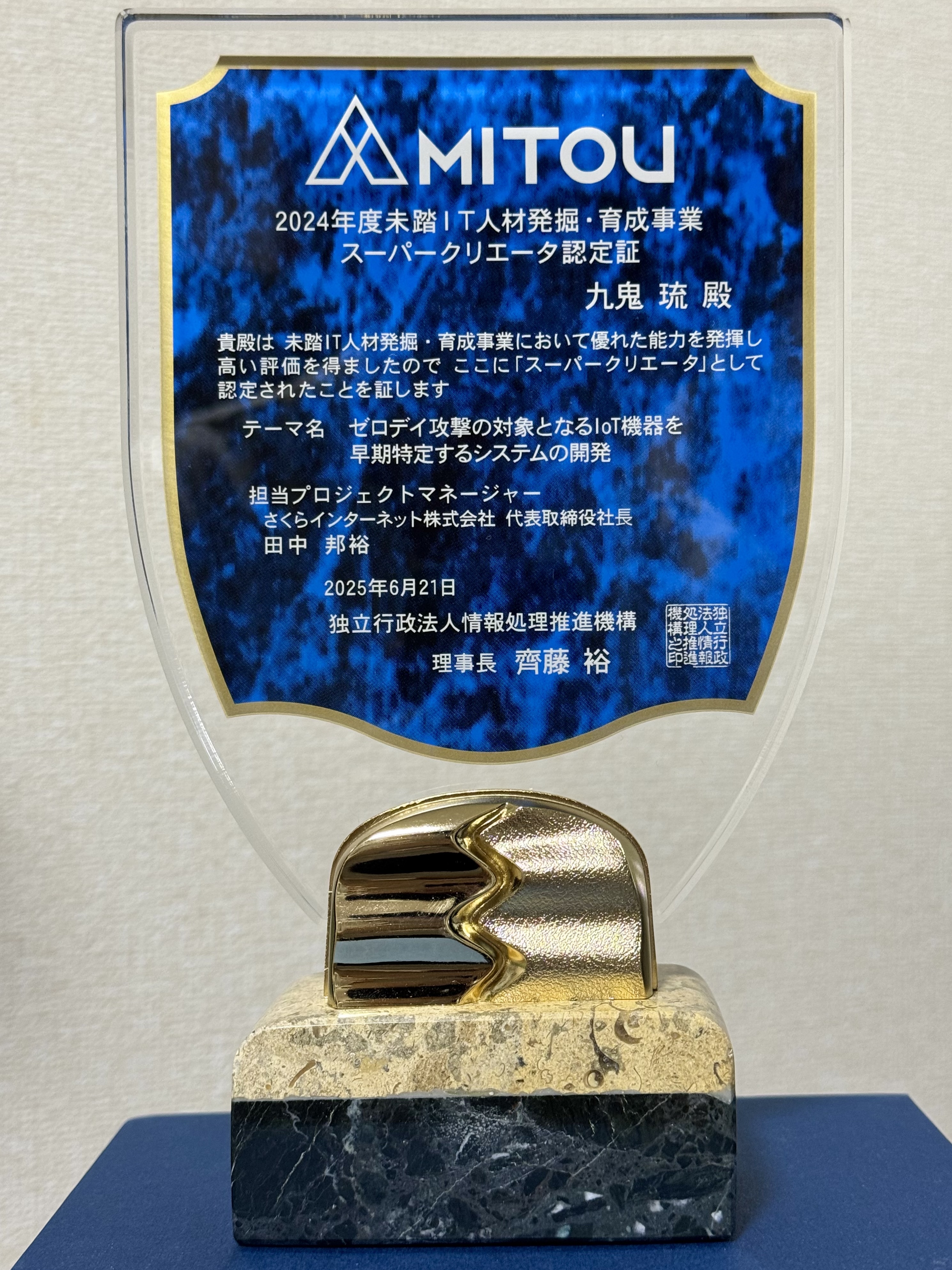 1.「未踏IT人材発掘・育成事業」のブースト会議(キックオフミーティング)で自身の採択プロジェクトについて発表した。2.「未踏IT人材発掘・育成事業」で開発したファームウェアを収集・解析するソフトウェアの概要と活用シナリオを示す図。3.「未踏IT人材発掘・育成事業」修了式/スーパークリエータ認定証授与式にて4.未踏IT人材発掘・育成事業 スーパークリエータ認定証